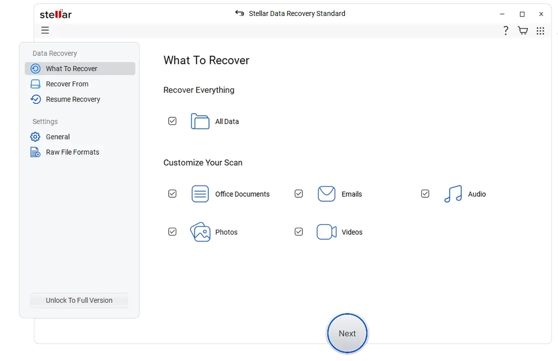 Stellar supports a wide range of documents (DOCX, PDF), images (JPG, PNG), videos (MP4, AVI), emails and many others.
