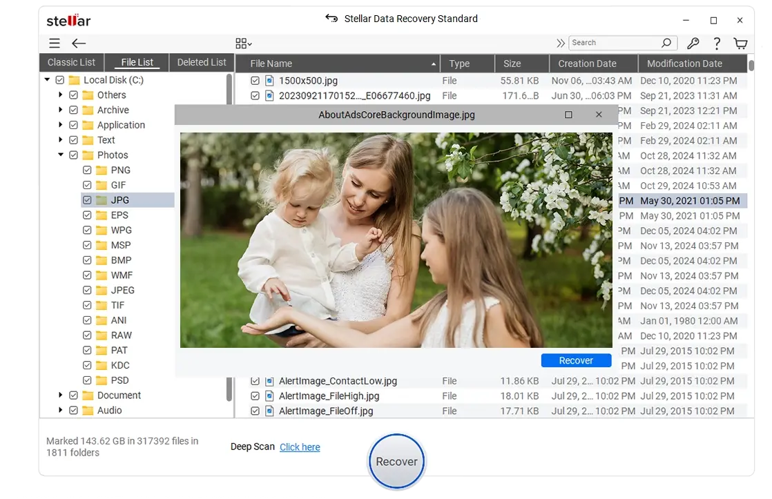 Stellar offers you the chance to preview the documents, pictures, or video files obtained through recovery before the files are returned to you. Also, for your convenience, the results can be organized according to the type of file, size, or date.
